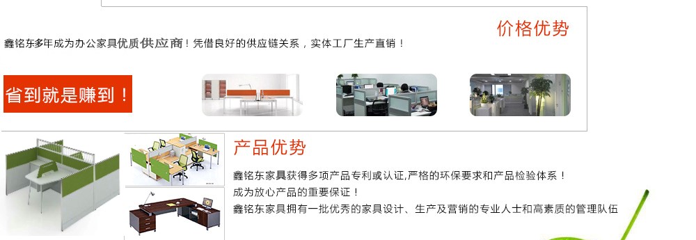 深圳市鑫銘東家具有限公司深圳市鑫銘東家具有限公司專業銷售各類辦公家具!產品涉及多種系列,如:班臺、班椅、屏風、會議桌、會議椅、辦公沙發、茶幾、辦公桌、文件柜、電腦桌椅、各式餐臺、餐椅、書柜等辦公家具。 鑫銘東家具擁有一批優秀的家具設計、生產及營銷的專業人士和高素質的管理隊伍。銘東家具以"先難后易"之戰略,在產品結構、產品質量及服務水平方面,均推陳出新,力求完善,精益求精。使我們的產品質量保持在國內外家具潮流的先進水平,力求滿足客戶的特殊需求。鑫銘東家具多年來致力于環保、實用家具的設計與開發,集生產、銷售、服務于一體。本著"以人為本"的設計理念,大量開發符合人體工程學的各種產品,以"誠信為本"的質量方針,真材實料,認認真真做產品,實實在在做人。鑫銘東家具更致力于創造"零維修率"的制造境界,實現"沒有維修的服務才是最好服務"的口號》了解更多 |